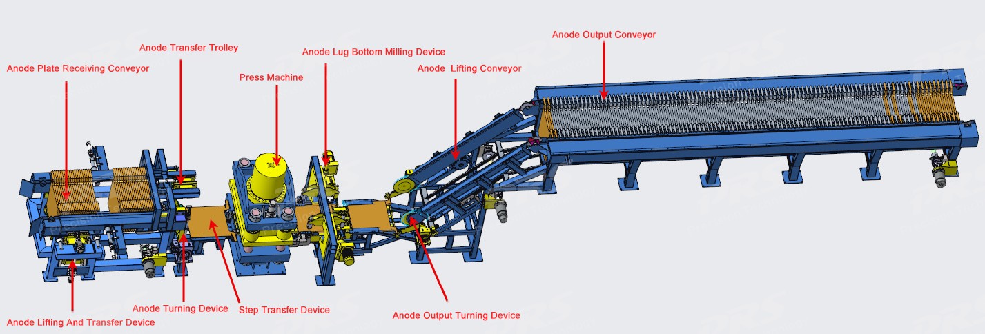The Anode Preparation Machine is mainly composed of Anode Receiving Conveyor, Anode Lifting and Transfer Device, Anode Plate Input Turning Device, Step Transfer Device, Horizontal Press, Anode Lug Bottom Milling Device, Anode Plate Output Turning Device, Anode Plate Lifting Device, Anode Plate Output Conveyor, etc.